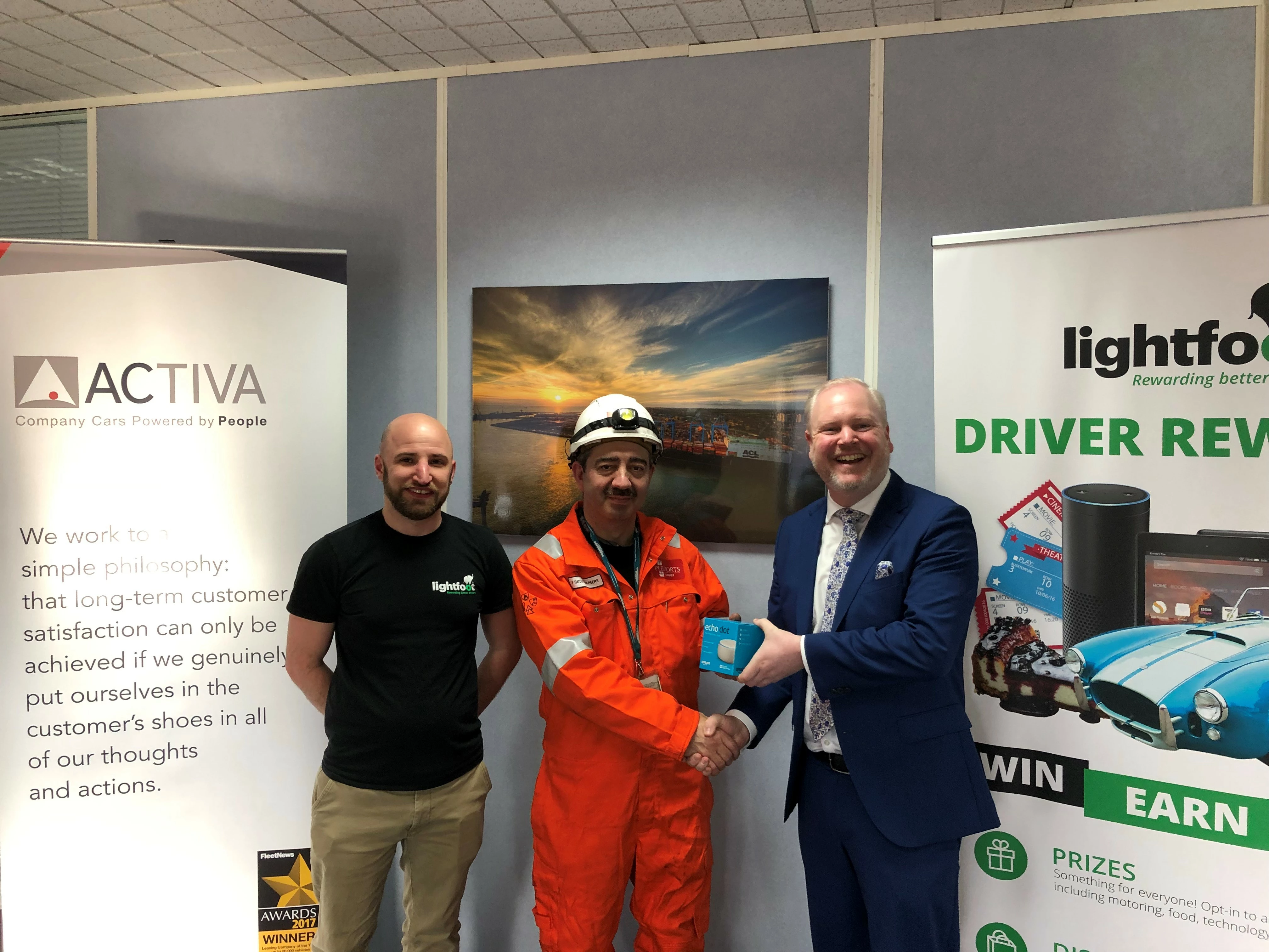 Mr Peers received an Amazon Echo Dot for his exceptional driving. He received his prize from Ed Bedford, Area Manager (North West) with Activa Contracts, and Tom Barrie, Account Manager with Lightfoot.